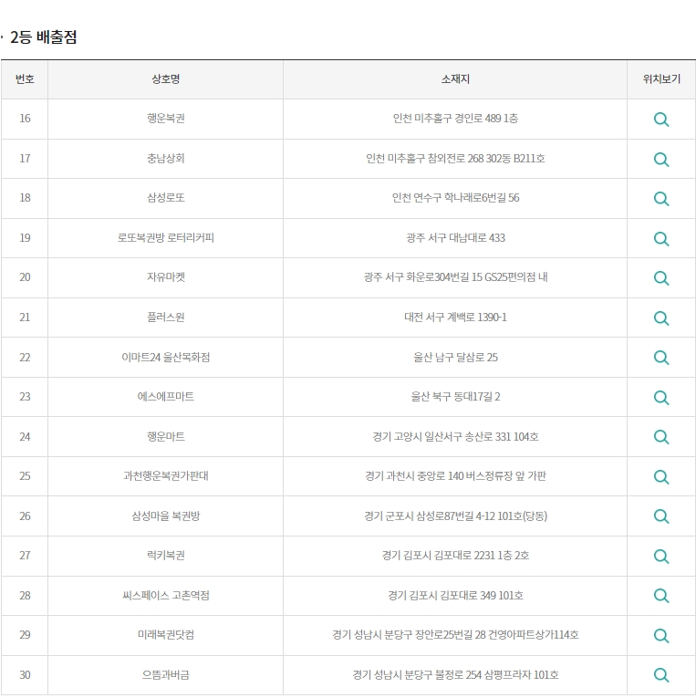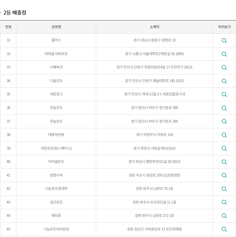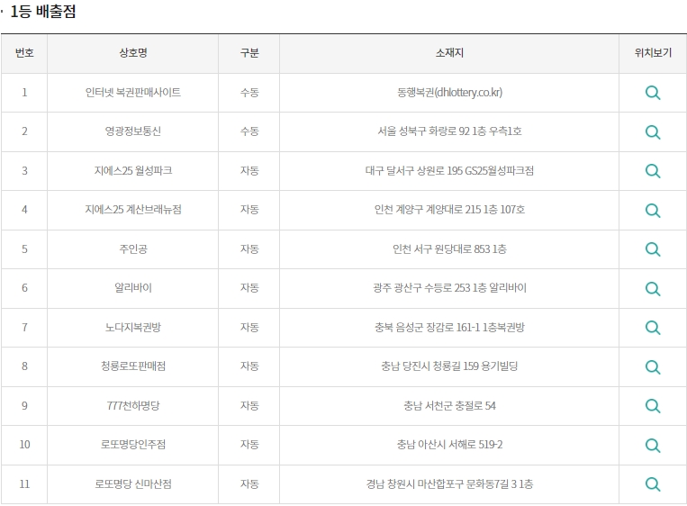 2등 배출점은 서울 강남, 금천, 동행복권, 서초, 송파, 양천, 영등포, 중랑구, 대구 달서구, 북구, 인천 남동구에서 배출되었습니다.