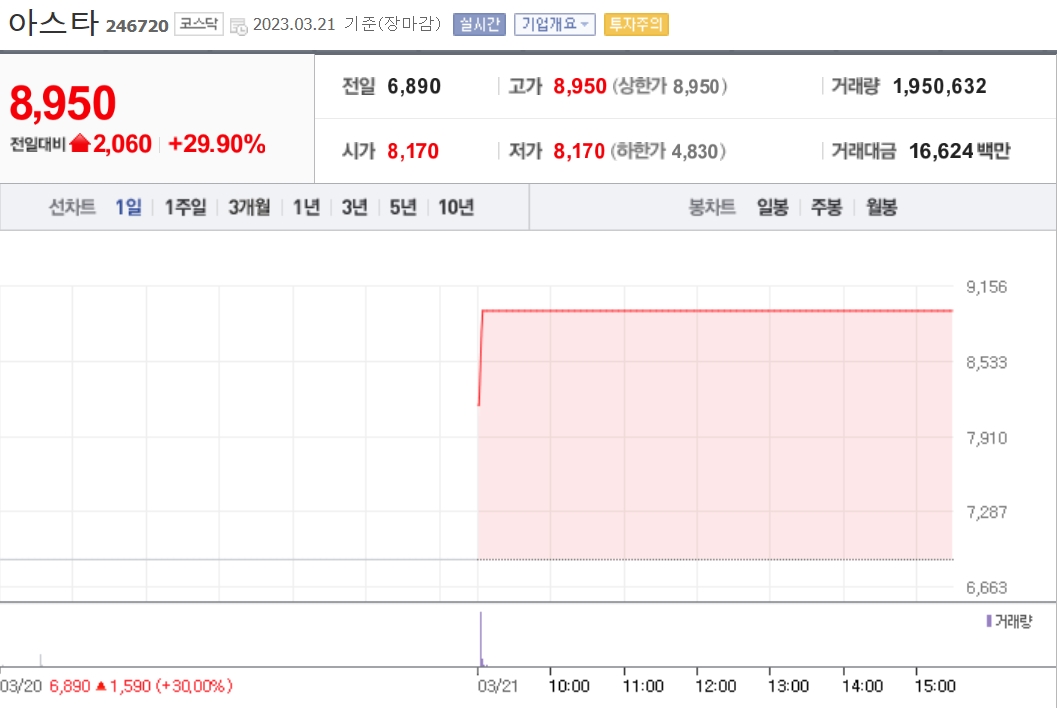 | 아스타 | 29.90% | 8,950원 | 사우디로부터 5억달러 투자 유치 소식에 3일연속 상한가 |